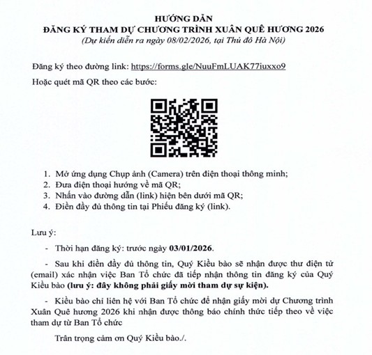 – Hoạt động dự kiến: Kiều bào tham dự tiệc chiêu đãi, chương trình Chủ tịch nước chúc Tết kiều bào và giao lưu nghệ thuật Xuân Quê hương 2026.