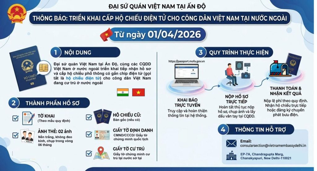Nhằm tạo thuận lợi cho công dân Việt Nam đang sinh sống, học tập và làm việc ở nước ngoài trong việc thực hiện thủ tục cấp hộ chiếu, đồng thời đẩy mạnh chuyển đổi số trong công tác quản lý xuất nhập cảnh, từ ngày 01/4/2026, Đại sứ quán Việt Nam tại Ấn Độ chính thức triển khai tiếp nhận hồ sơ và cấp hộ chiếu phổ thông có gắn chíp điện tử (gọi tắt là hộ chiếu điện tử – e-passport) cho công dân Việt Nam đang cư trú ở nước ngoài.
